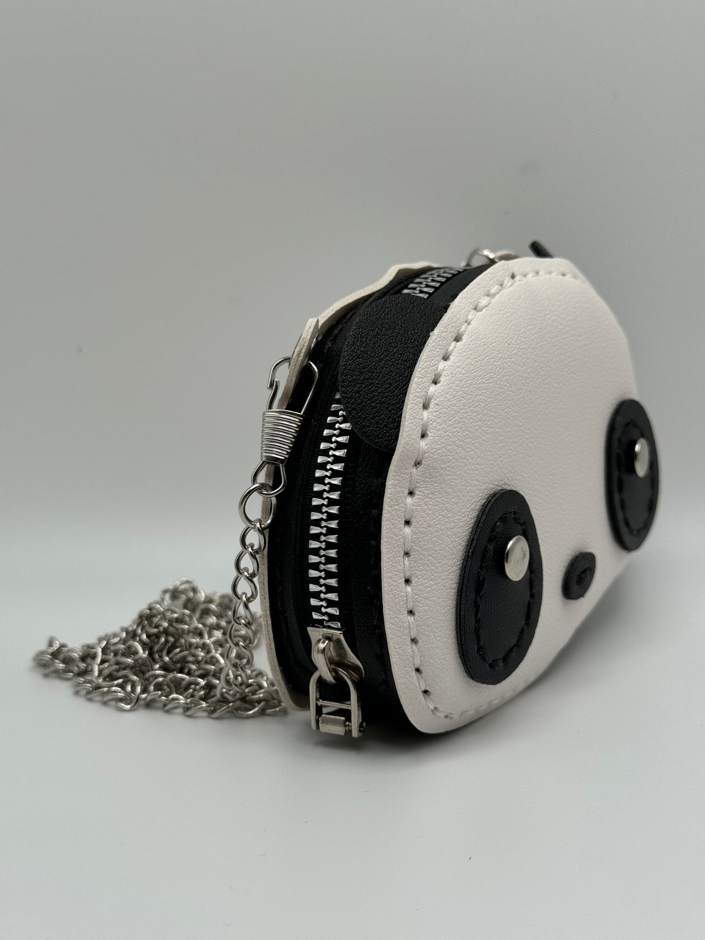 A cute and compact panda-shaped coin pouch made of soft faux leather. Features a silver chain for easy carrying, perfect for storing small essentials with playful charm.
